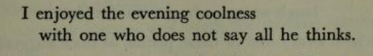 There are: the season of the year (it is summer, hot summer, because the poet has been longing for the evening) ; the sounds of the world (after the noisy day, it is becoming quiet, so that even speech would be an intrusion); the light (growing dimmer into the restful darkness); the situation (two men sitting together, far from noisy parties); the mood (rest and meditation); and the thought behind the whole (that there is greater understanding, of nature and of friends, in almost silent companionship — not in complete silence, but in those brief words which are more eloquent than long speeches or busy conversation )